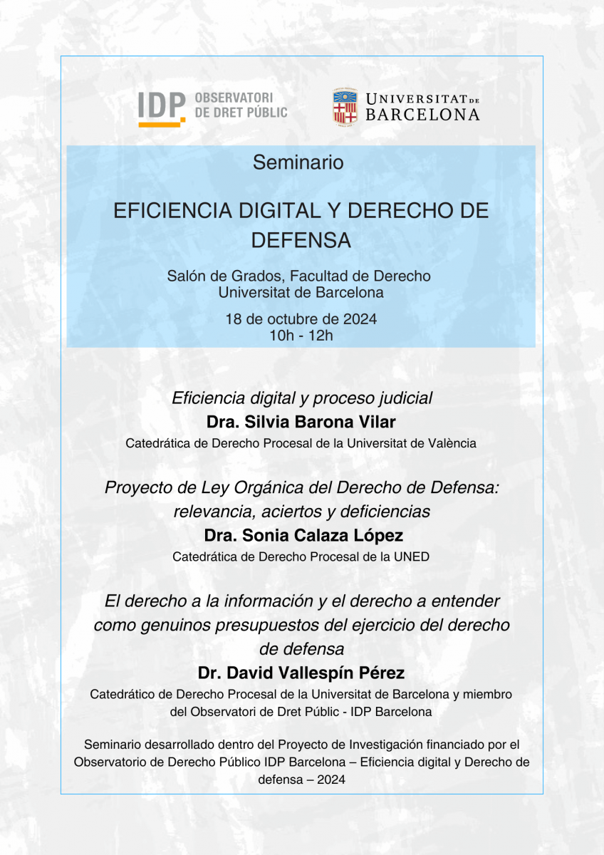 El viernes 18 de octubre de 2024 se llevará a cabo el seminario titulado «Eficiencia digital y derecho de defensa», como parte de la Convocatoria de Propuestas de Actividades y Proyectos de Investigación Propios financiados por el Observatorio de Derecho Público (Convocatoria 2024).