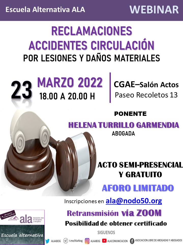 Desde la Escuela Alternativa de ALA os invitamos a participar e este nuevo WEBINAR sobre reclamaciones de accidente de circulación por lesiones y daños