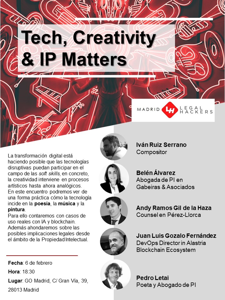 La transformacioÌn digital estaÌ haciendo posible que las tecnologiÌas disruptivas puedan participar en el campo de las soft skills, en concreto, la creatividad interviene en procesos artiÌsticos hasta ahora analoÌgicos.En este encuentro podremos ver de una forma praÌctica coÌmo la tecnologiÌa incide en la poesiÌa, la muÌsica y la pintura. Para ello contaremos con casos de uso reales con IA y blockchain. AdemaÌs ahondaremos sobre las posibles implicaciones legales desde el aÌmbito de la Propiedad Intelectual.Para ello contaremos con: